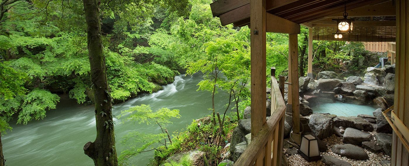 「鶴仙渓の渓流がすぐ側を流れる露天風呂を体感できます」